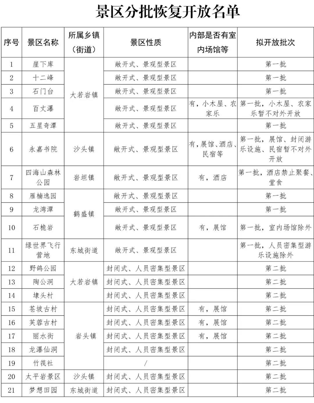 楠溪江景区分批逐步恢复开放营业,敞开式、景观型景区作为第一批开放景区,向属地乡镇(街道)报备后即可恢复开放营业,其室内场馆、游乐设施暂缓开放,不得举办集聚式项目活动。封闭式、人员密集型景区作为第二批开放景区,暂缓恢复开放营业。