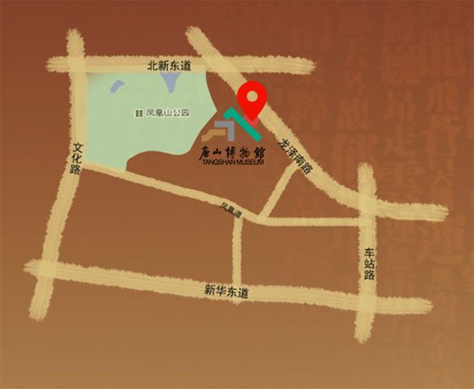 唐山西下高速,市区方向一直东行约9.6公里,北新道与龙泽路交叉口右转南行200m至唐山博物馆