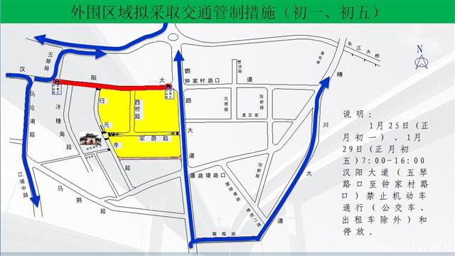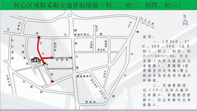 二、1月25日(正月初一) 、1月29日(正月初五)7:00-16:00汉阳大道(五琴路口至钟家村路口)禁止机动车通行(公交车、出租车除外)和停放。