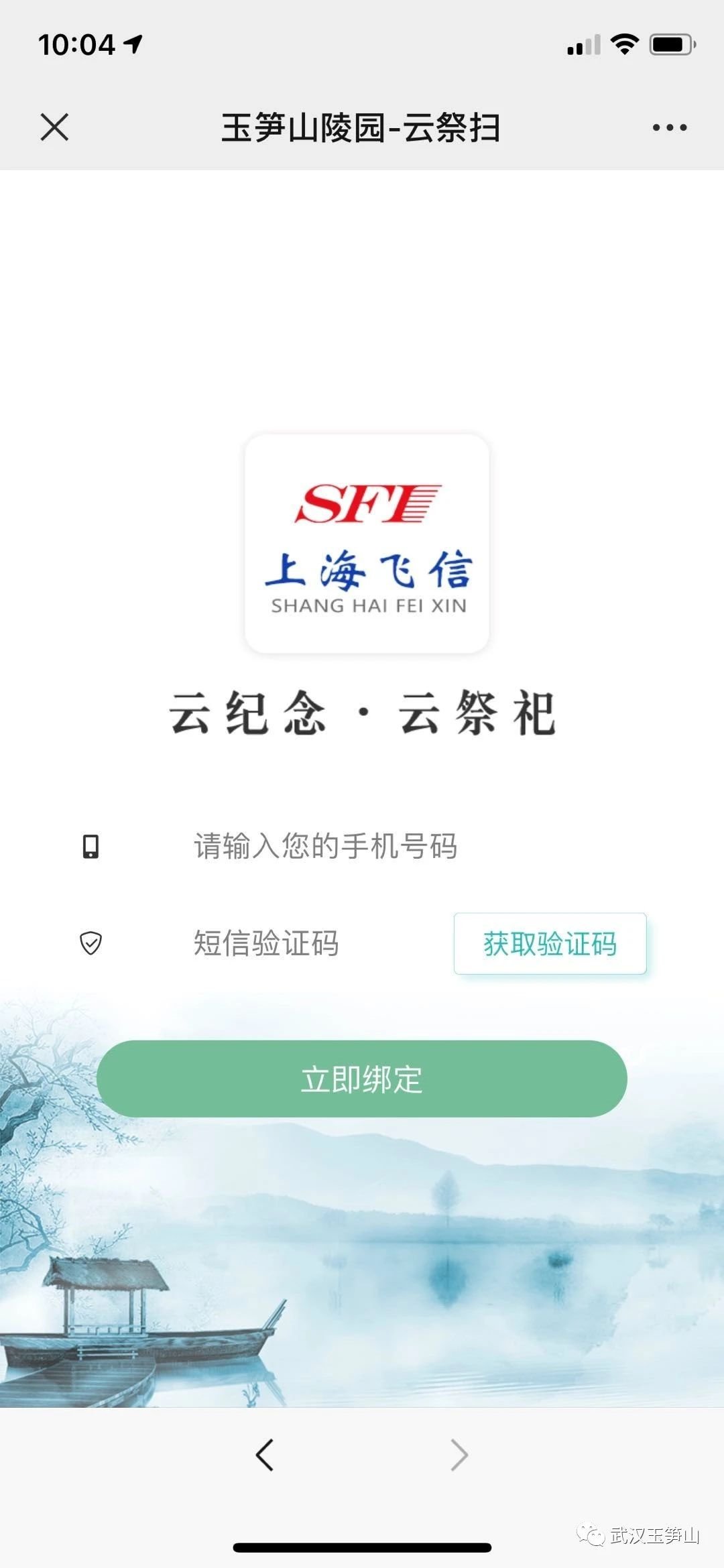 没有注册账号的用户,需要输入手机号码进行短信验证,点击立即绑定,绑定成功后即可进入“云祭扫”页面。