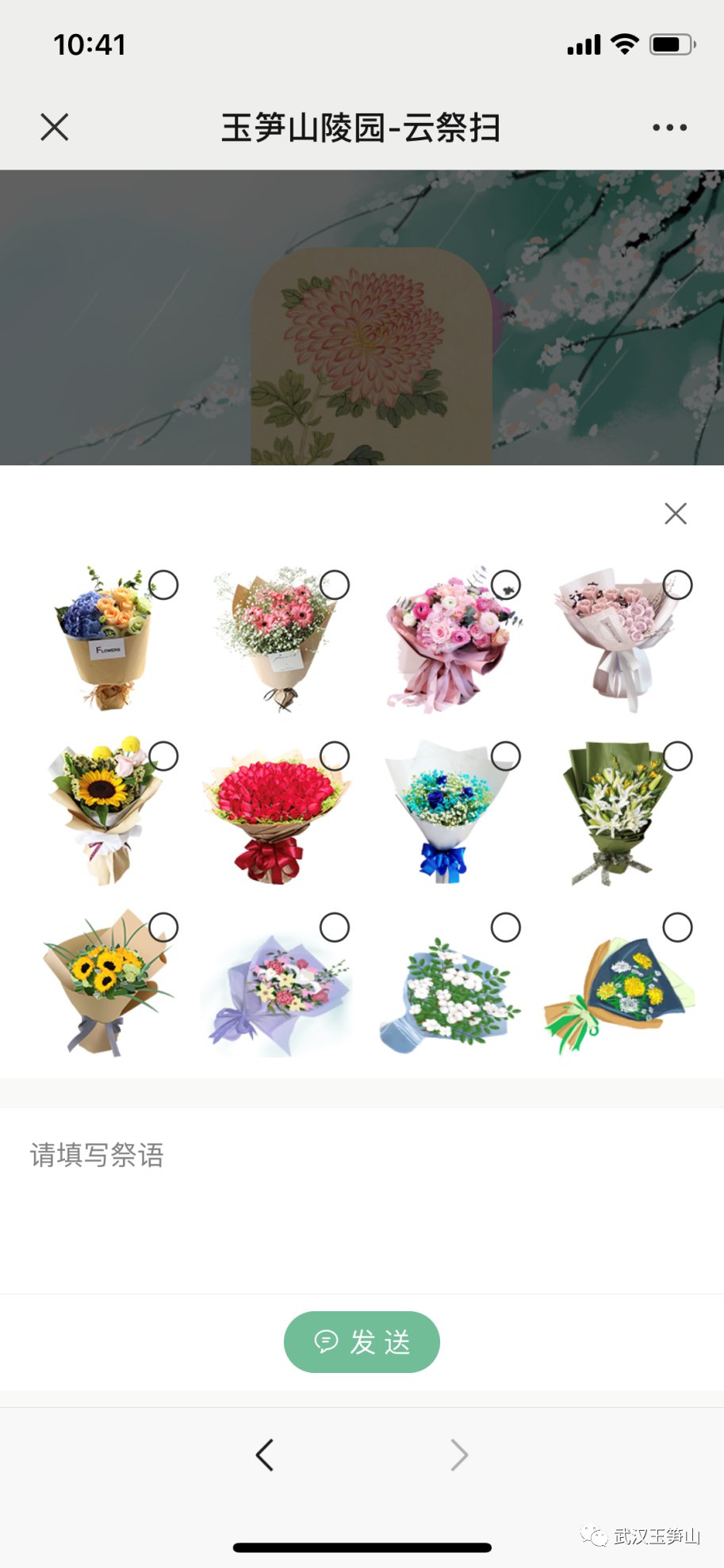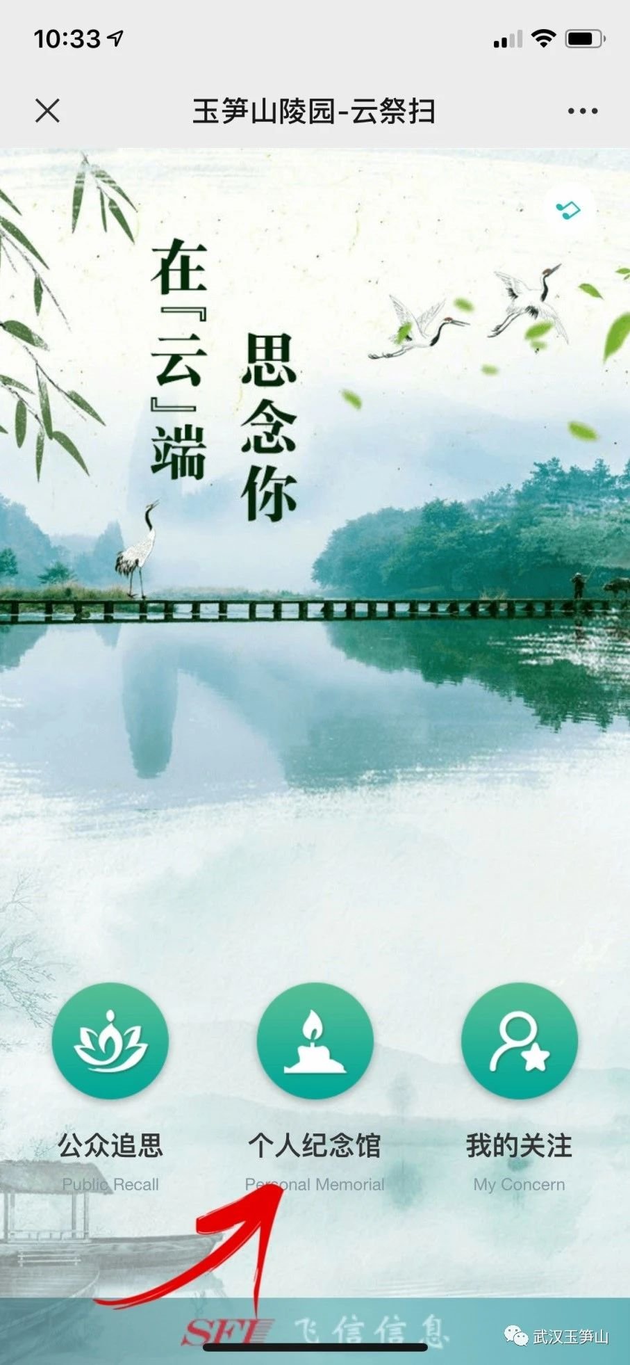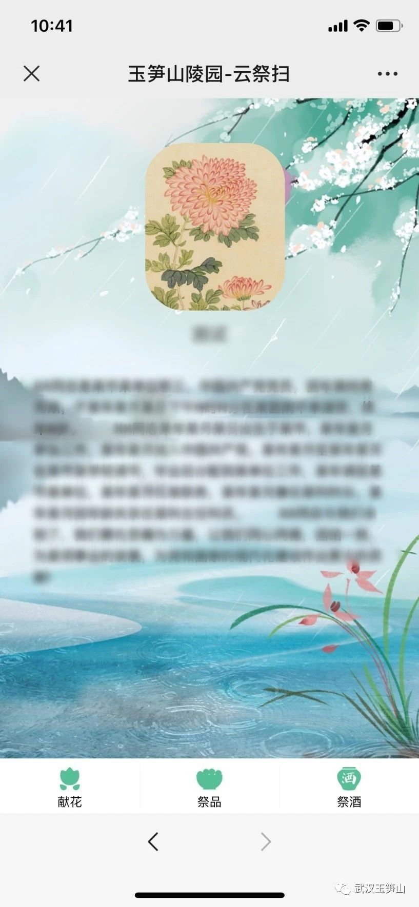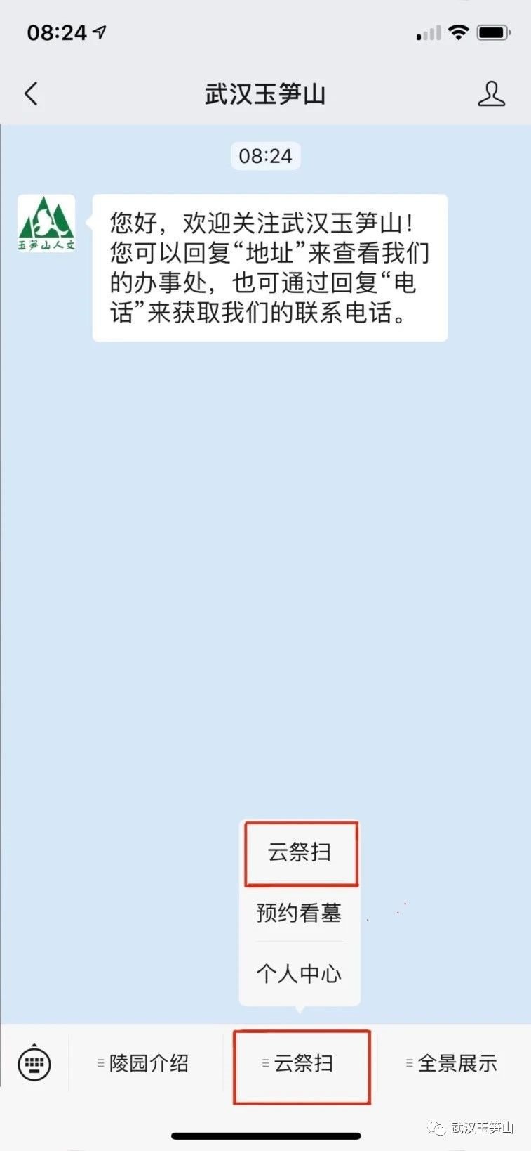 步骤1:微信搜索武汉玉笋山微信公众号,点击关注,进入“云祭扫”页面。