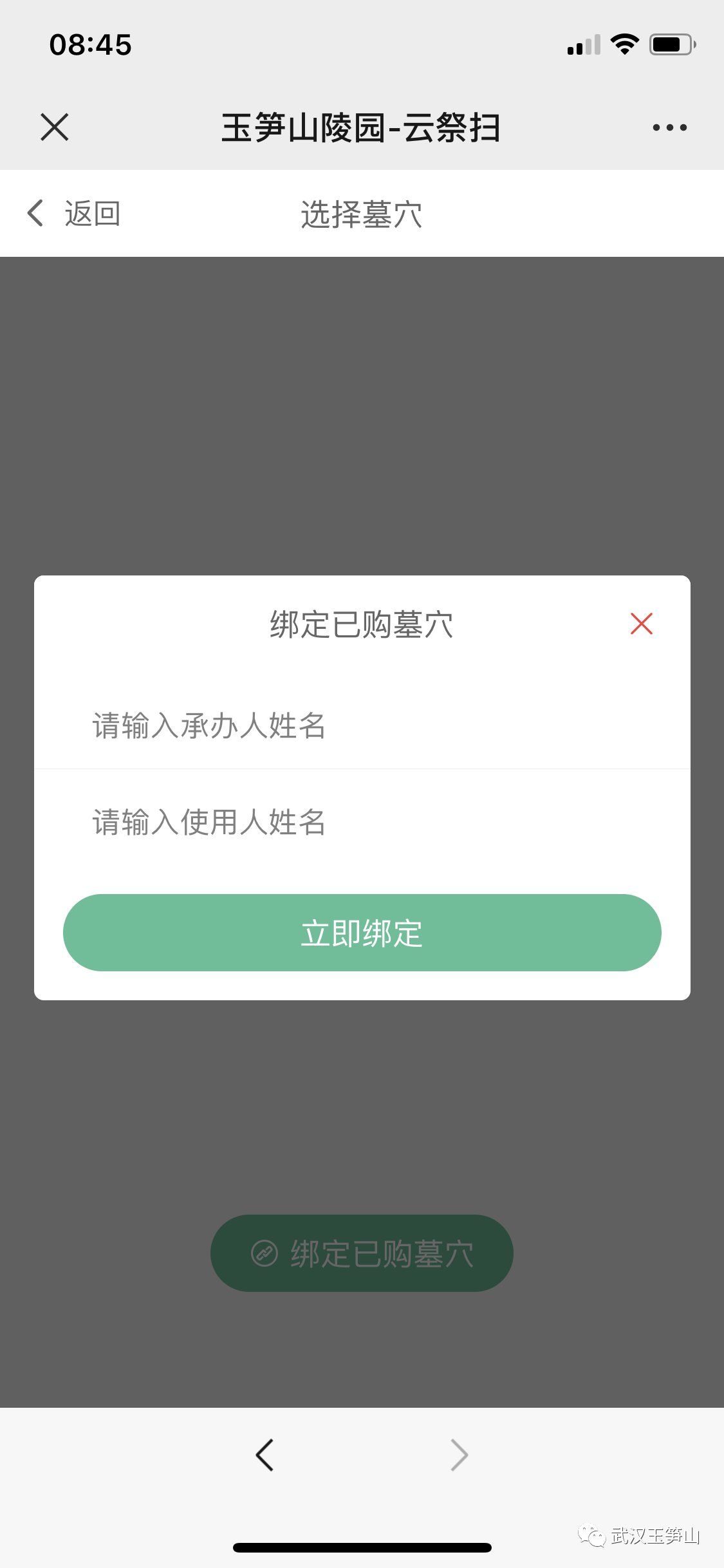 步骤6:输入承办人姓名,以及使用人姓名(即逝者姓名)后,点击“立即绑定”即可绑定墓位。