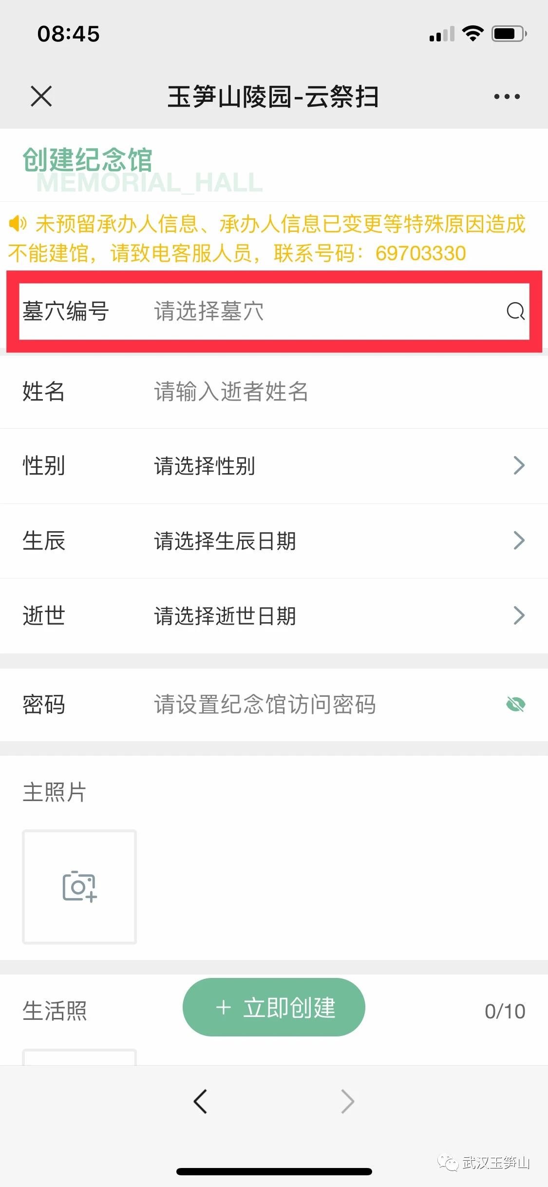 步骤4:创建纪念馆,选择墓穴编号。