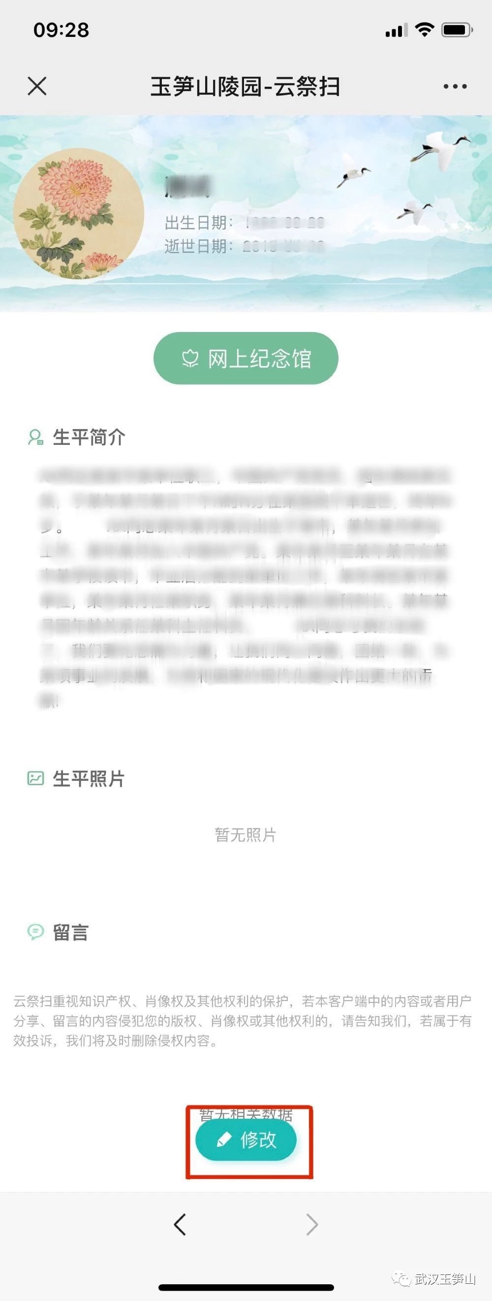 若创建成功个人纪念馆后,有问题需要修改,或需要添加照片,则可以点击页面最下方“修改”,即可修改内容。