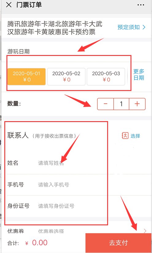 注:此0元票仅限腾讯旅游年卡、湖北旅游年卡、大武汉旅游年卡、黄陂惠民卡预约使用,入园需刷腾讯旅游年卡、湖北旅游年卡、大武汉旅游年卡及黄陂身份证。(没有腾讯旅游年卡、湖北旅游年卡、武汉旅游年卡和黄陂身份证证件无法使用此票。)