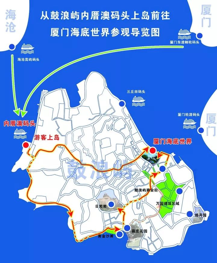 从厦门轮渡乘船到达鼓浪屿三丘田码头或内厝澳码头后,步行直达厦门海底世界景区参观线路图:
