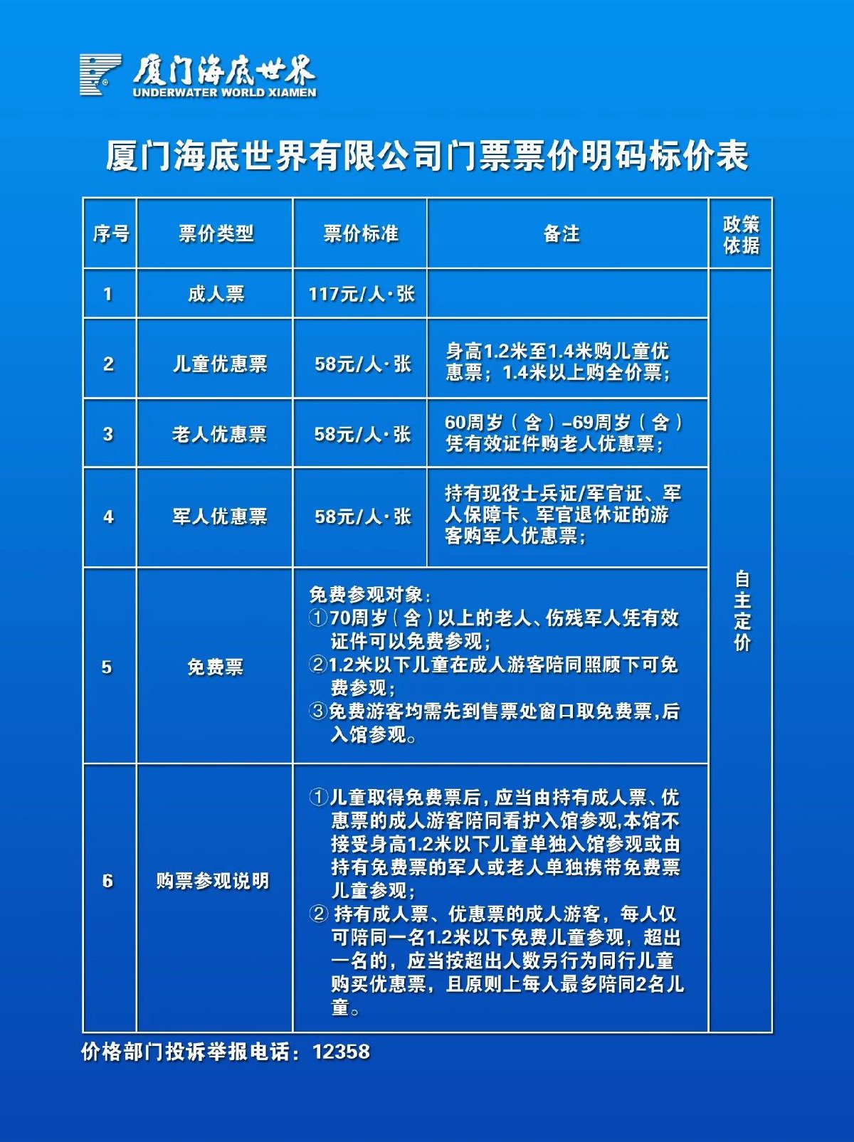 【线上订票须知】 1、厦门海底世界微信售票开放时间:08:00-17:00; 2、微信订票可提前1~30天购票,订票后30分钟内完成付款,逾期自动关闭订单; 3、购票时须选择指定游玩日期至景区兑换使用; 4、微信售票系统目前处在测试与调整的试运营阶段,若遇到购票问题请及时联系我们; 5、咨询热线:0592-2571610、2571611; 【兑票须知】 1、购票者凭手机号+订单号到厦门海底世界售票处团队窗口兑换纸质门票; 2、微信预订门票一经兑换纸质门票,恕不退换,纸质门票涂改无效,副券撕下视为已使用。 3、厦门海底世界在节假日及旅游旺季实行单向参观路线,敬请合理安排参观时间。 4、如需开具发票,请在购票当月,正常售票时间内,持票根至售票窗口开具税务发票。 【退票须知】 1、通过微信平台购买的门票未兑换且未使用,可在门票预订指定游玩日期后30天(含)内申请退款(审核成功后7个工作日内退回支付账户); 2、预订门票过期未使用并且超过30天(含)未申请退款,则逾期作废,概不支持退票;