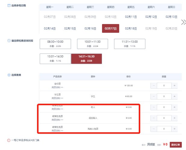 注:以上免费观众需出示相关有效证件从检票口专用通道直接入院参观,需要提前在官方进行预约。