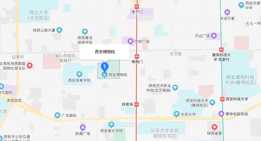 西安博物院位于西安碑林区,北门地址为西安市碑林区友谊西路72号,西门地址为西安市碑林区朱雀大街中段。