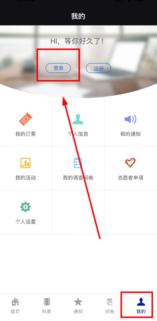 1、下载并安装“沈阳科学宫”APP,点击底部菜单栏“我的”→“登录”(未注册的需先根据提示进行注册);