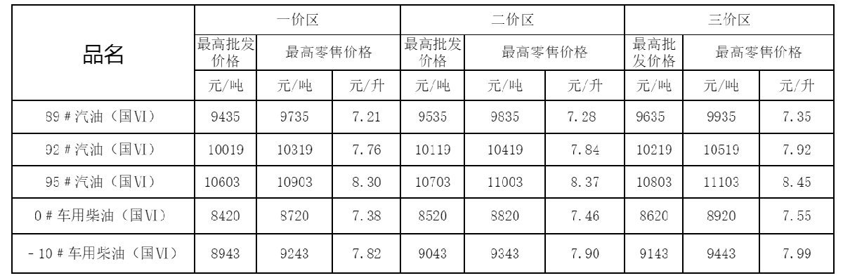 2.表中汽油和柴油价格为符合第六阶段强制性国家标准VIA(B)车用汽油和VI车用柴油价格。