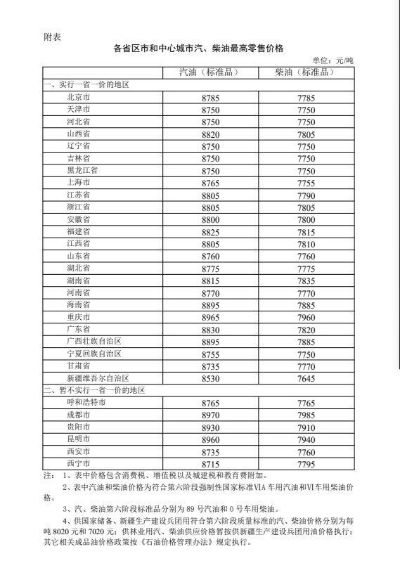 附:各省区市和中心城市汽、柴油最高零售价格