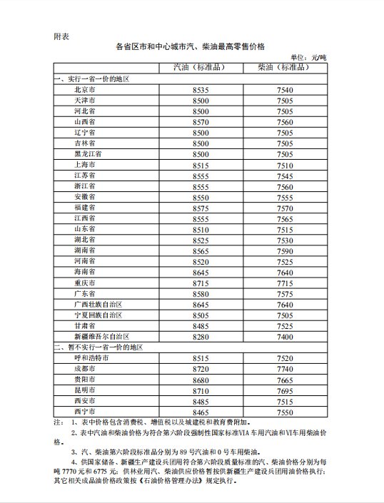 根据近期国际市场油价变化情况,按照现行成品油价格形成机制,自2021年8月23日24时起,国内汽、柴油价格(标准品,下同)每吨分别降低250元和245元。调整后,各省(区、市)和中心城市汽、柴油最高零售价格见附表。相关价格联动及补贴政策按现行规定执行。