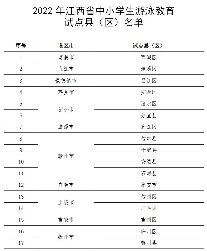 2022年3月4日,江西省教育厅发布《关于公布2022年江西省中小学生游泳教育试点县(区)名单的通知》,认定南昌市西湖区、九江市濂溪区、景德镇昌江区等17个县(区)为“江西省中小学生游泳教育试点县(区)”。