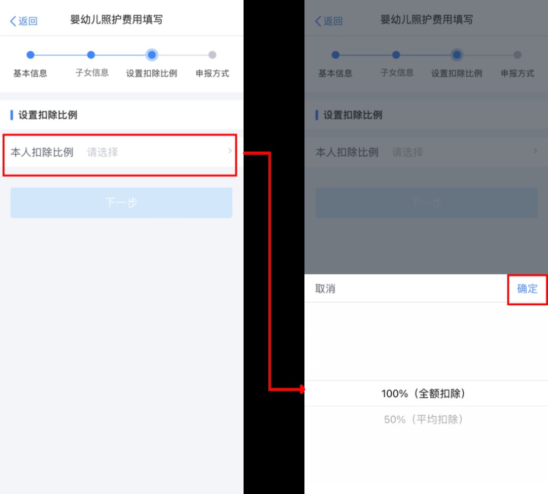 完成子女信息填写后,纳税人根据实际情况在“本人扣除比例”中选择100%(全额扣除)或50%(平均扣除)其中一种。选择完成并确定后,点击“下一步”。