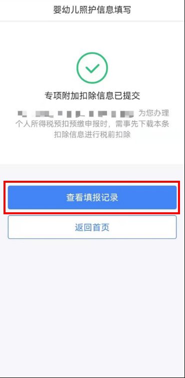 选择完成后,点击“提交”,即完成3岁以下婴幼儿照护专项附加扣除填报流程,系统将弹出“专项附加扣除信息已提交”的提示。纳税人可以点击“查看填报记录”查看已经申报的专项附加扣除信息。