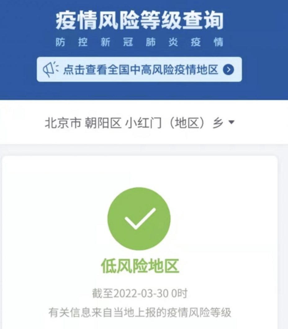 3月30日零时,国务院客户端小程序疫情风险等级查询显示,北京朝阳区小红门乡肖村已经由中风险区调整为低风险区。