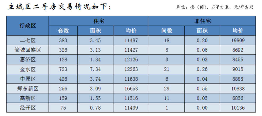郑州全市二手房共成交3332套(间),成交面积34.25万平方米,成交均价10663元/平方米;其中住宅二手房共成交3219套,成交面积32.69万平方米,成交均价10692元/平方米。(备注:二手房均价是以评估指导价为计算依据)