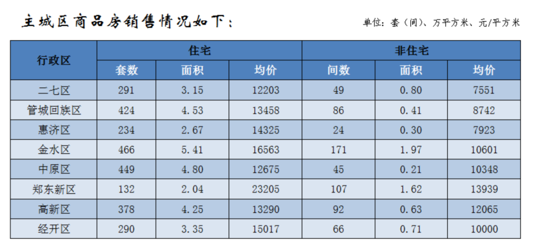郑州全市商品房销售6324套(间),销售面积72.76万平方米,销售均价10697元/平方米;其中商品住宅销售5323套,销售面积61.6万平方米,销售均价10936元/平方米。非住宅销售1001套(间),非住宅销售面积11.16万平方米,非住宅销售均价为9382元/平方米。