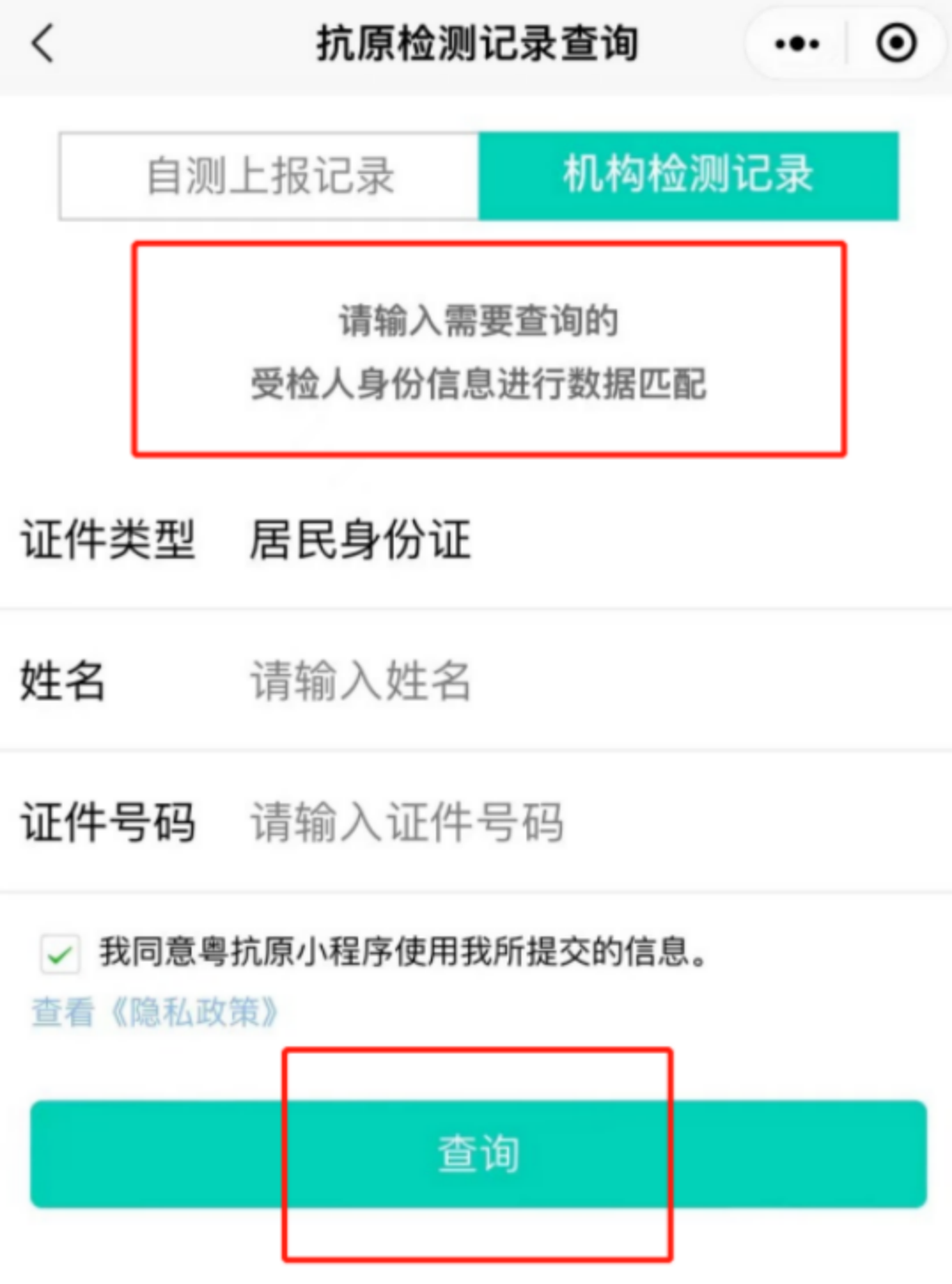 若居民是查询由医疗卫生机构检测的抗原检测结果应选择【机构检测记录】填写需要查询的受检人身份信息点击【查询】获取检测结果。