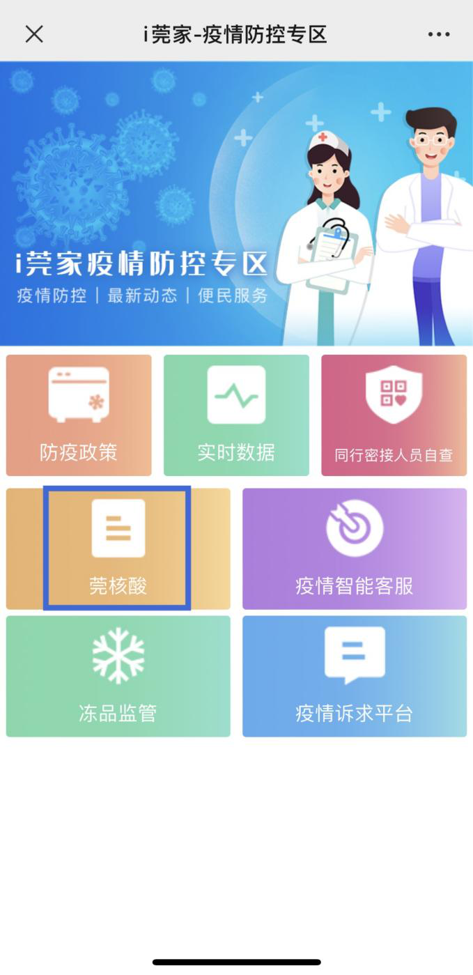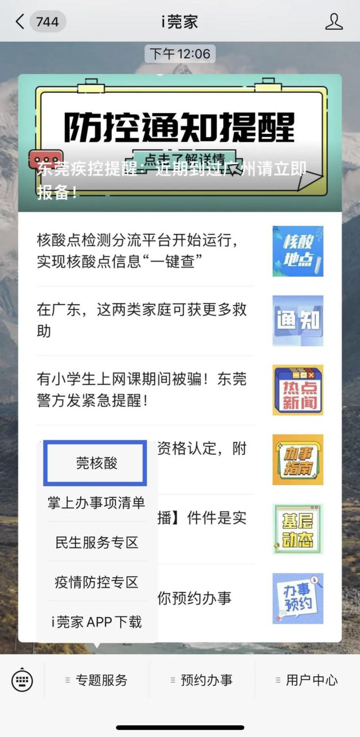 关注“i莞家”微信公众号,在菜单栏“专题服务”中选择“莞核酸”,点击后同样能进入平台主页面。