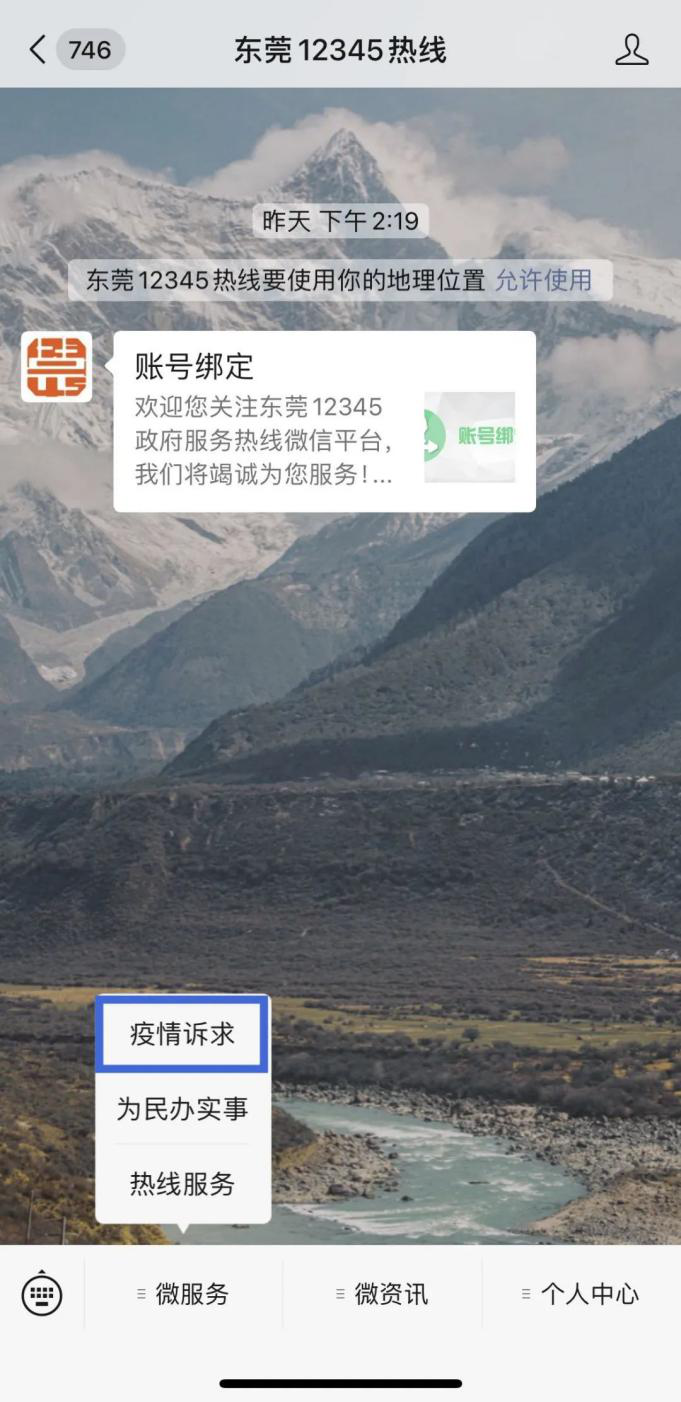 关注“东莞12345热线”微信公众号,在菜单栏“微服务”中选择“疫情诉求”,即可进入平台主页面。