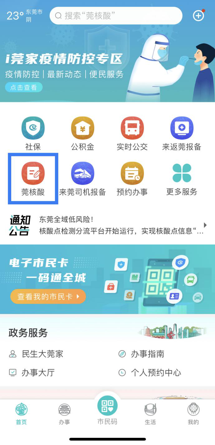 在APP首页点击“莞核酸”,授权成功即可进入平台主页面。