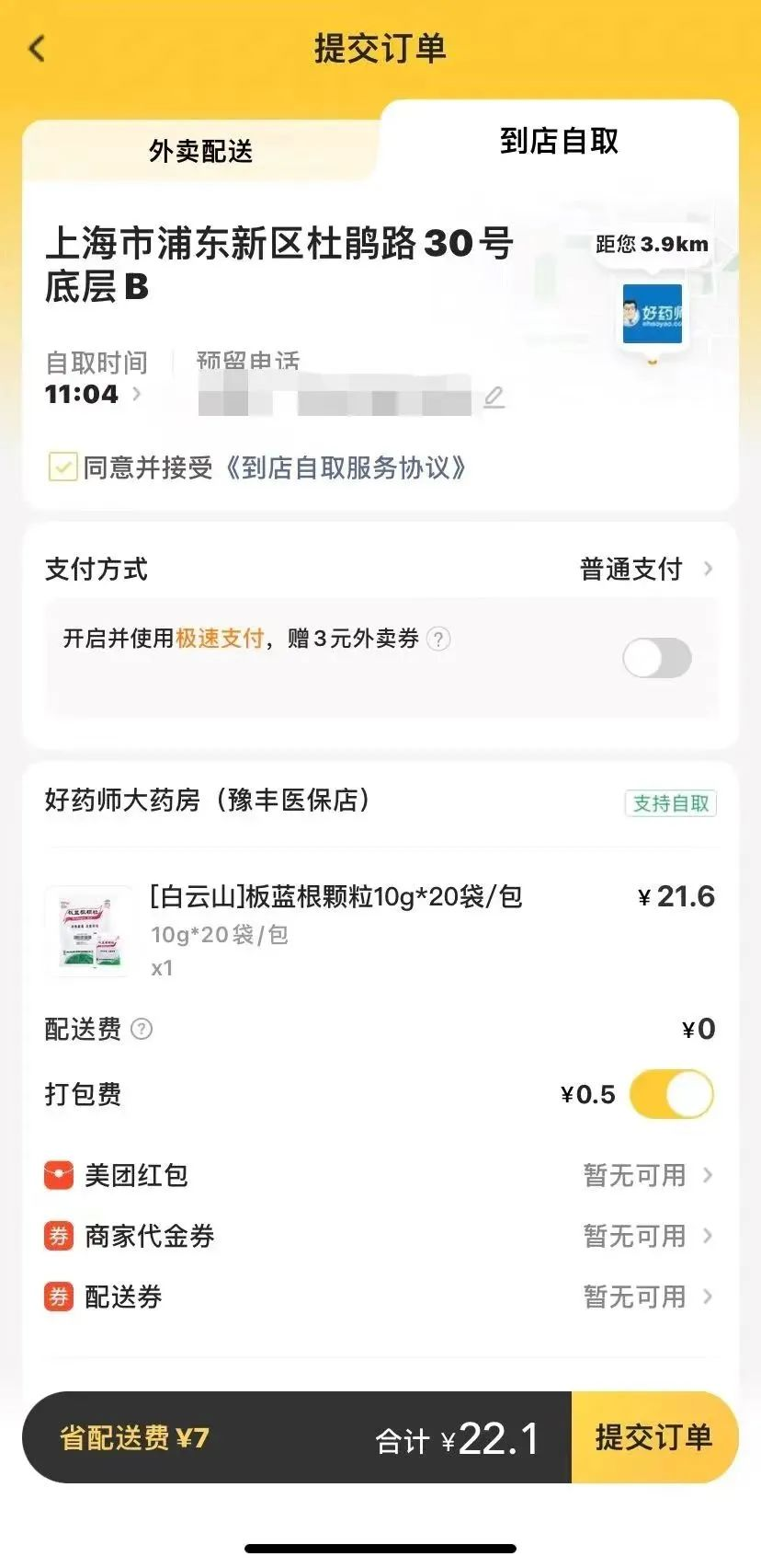 打开线上平台→→搜索所需药品→→下单购买→→提交订单页面,选择外卖配送或者到店自取