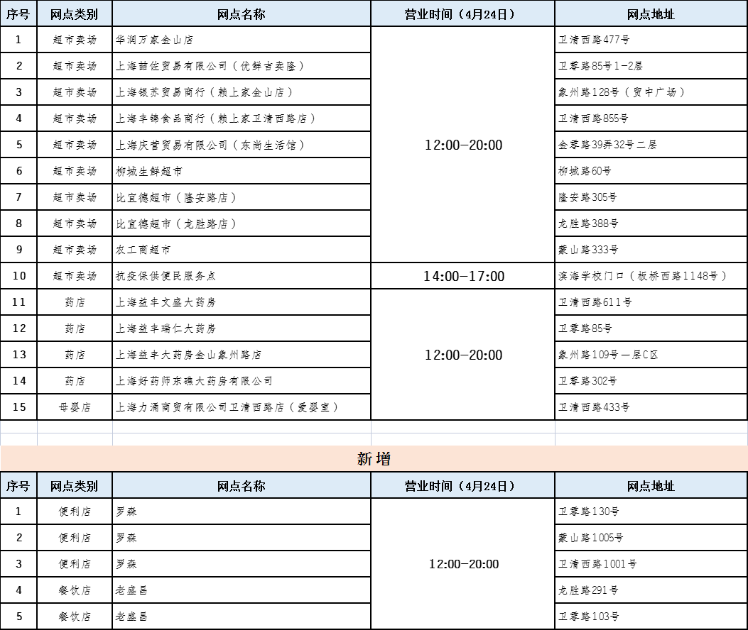 2、新增便利店与餐饮店,超市卖场、药店、母婴店、便利店、餐饮店4月24日营业时间为12:00-20:00(抗疫保供便民服务点营业时间为14:00-17:00);25日起超市卖场营业时间请参照各超市公告。