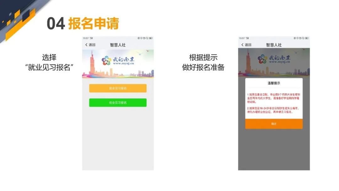 用人单位想要加入成为见习单位,只要登录南京市人社局网站,点击“用户登录”进行申请即可。研究生想要参加见习,可通过“我的南京”手机APP“智慧人社”模块,进入“就业服务”报名。