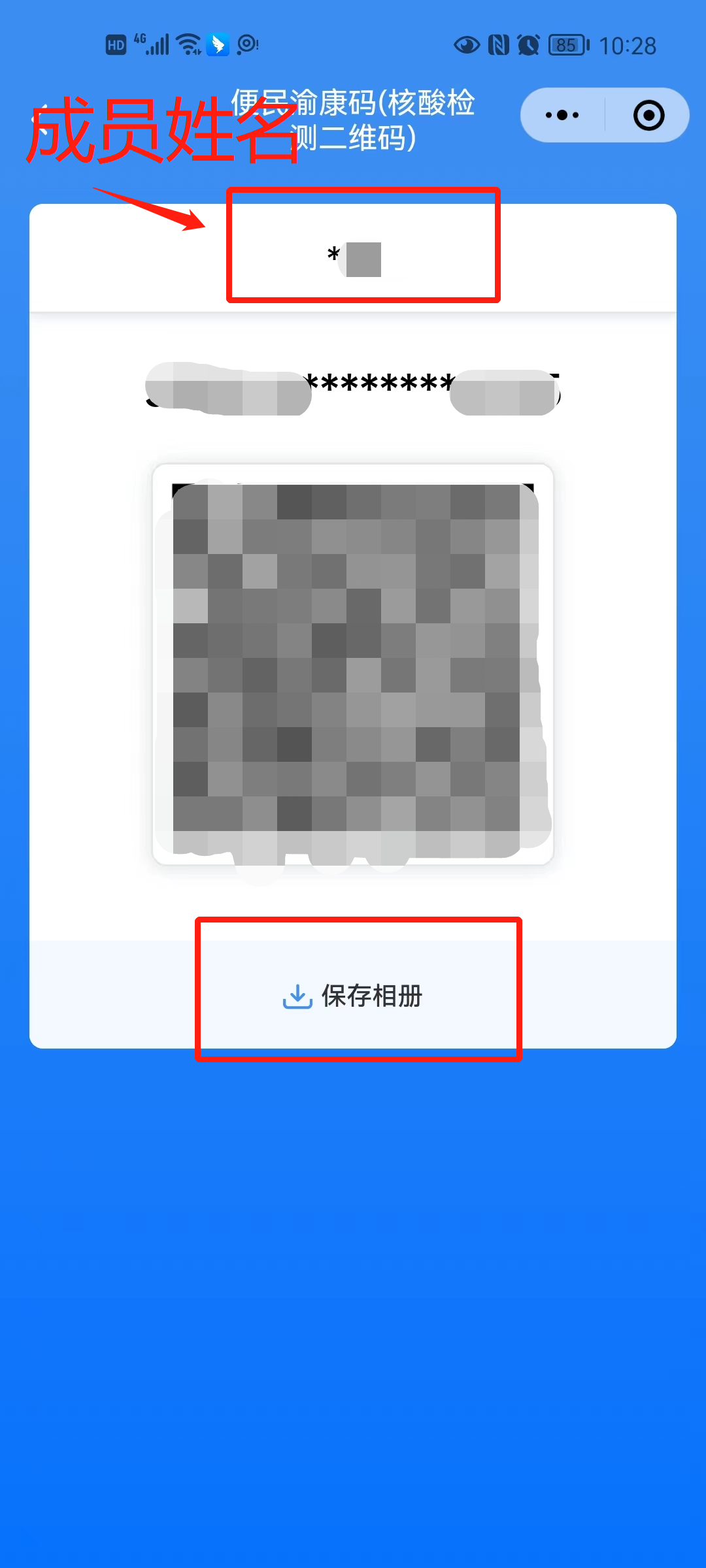 5.将该名成员的便民渝康码保存到相册,打印生成实体“二维码”。