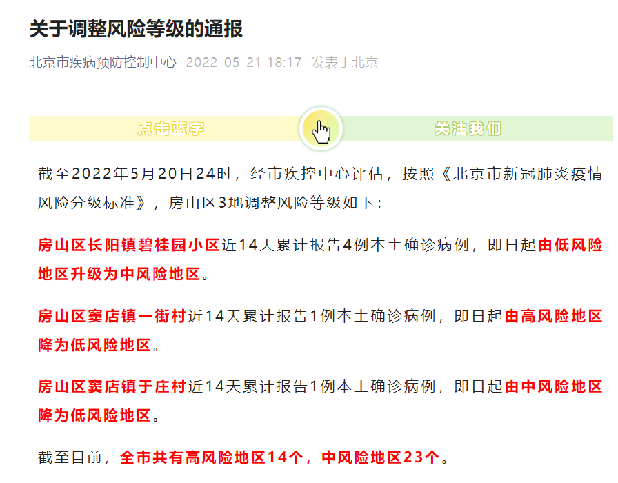 截至5月21日18时,北京市共有高风险地区14个,中风险地区23个。