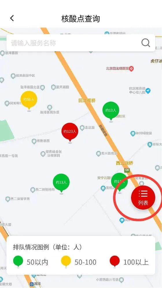 2. 【核酸检测点】功能页面,核酸点气泡的颜色代表当前点位排队的人数。
