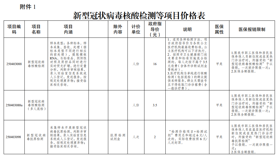 一、进一步下调公立医疗机构新冠病毒核酸检测的政府指导价。单人单检降至不高于每人份16元;多人混检统一降至每人份不高于3.5元。检测项目价格含检验相关的试剂等耗材,为各级公立医疗机构最高指导价格,不得上浮,医疗机构可以下浮执行。同步调整完善新冠病毒核酸检测项目(含单、混检)的医保报销属性及报销限制,具体详见附件1。