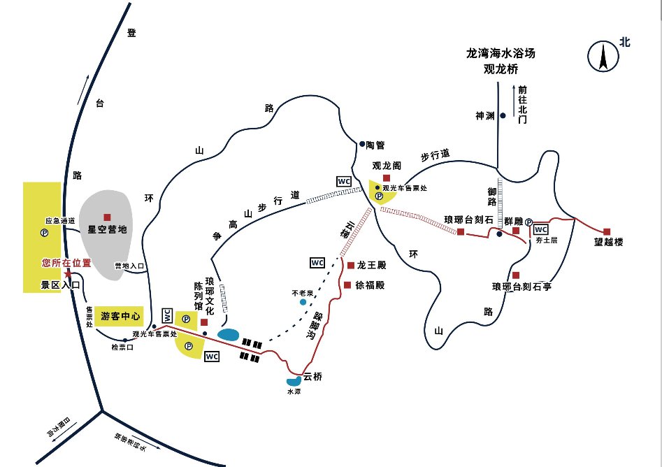琅琊文化陈列馆→跺脚沟→徐福殿→龙王殿→云梯→观龙阁→琅琊台刻石→台顶→秦始皇遣徐福入海求仙群雕像→琅琊亭→望越楼