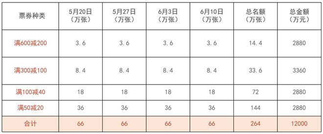 本次 "520" 消费券包含 " 满 600 元减 200 元 "、" 满 300 元减 100 元 "、" 满 100 元减 40 元 "、" 满 50 元减 20 元 " 四种类型,面额设置多样灵活,市民可按需选择一种领取一张。