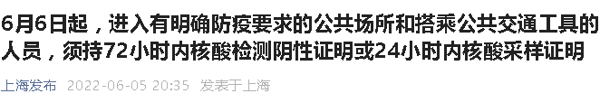 根据当前疫情发展形势,市疫情防控工作领导小组办公室决定:自6月6日零时起,进入有明确防疫要求的公共场所和搭乘公共交通工具的人员,须持72小时内核酸检测阴性证明或者24小时内核酸采样证明。也就是说,如果市民采样后,还没有及时获得检测结果的话,只要有24小时内的采过样的证明,就可以进入上述公共场所和搭乘公共交通工具。大家可以在“随申办”APP的“核酸查询”页面中,看到自己的采样时间。