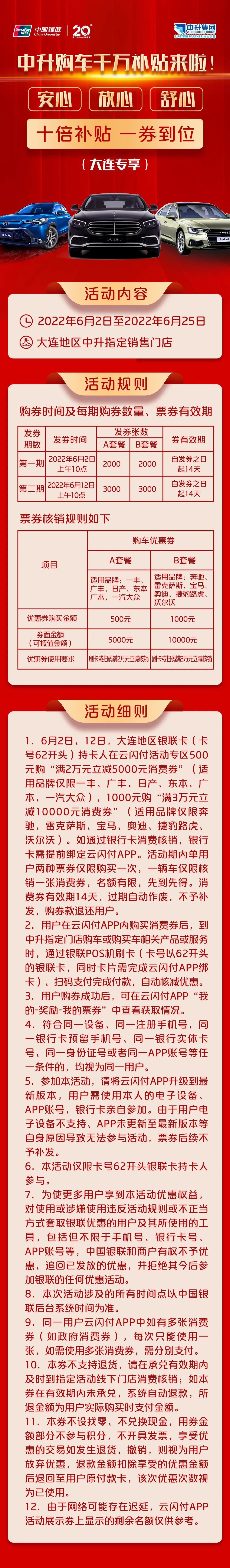 近日,中国银联与中升集团联合推出,大连人专享的1万张价值7500万元的购车补贴消费券。