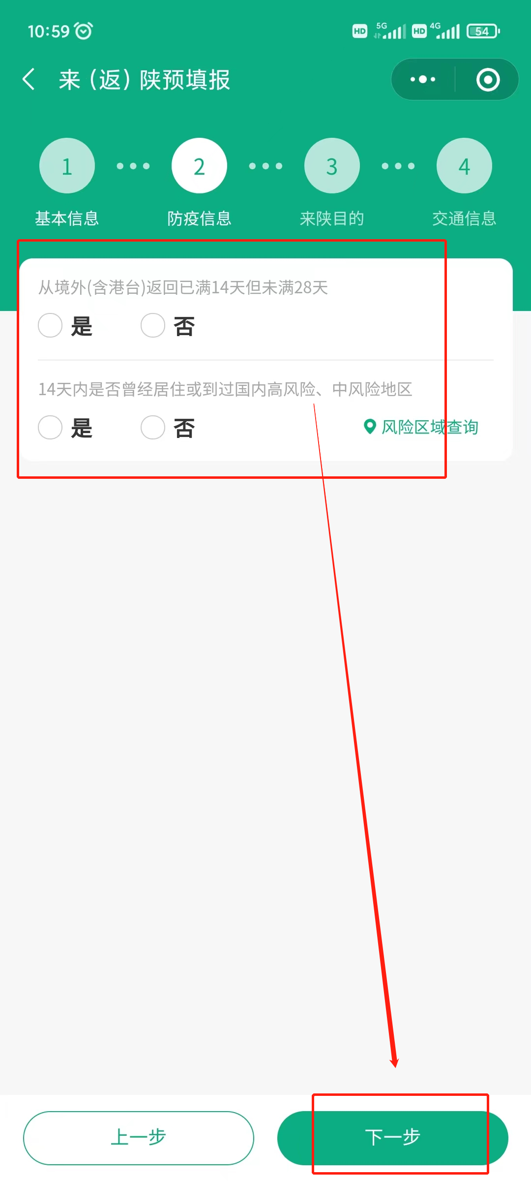 5、填写防疫信息后,点击下一步;