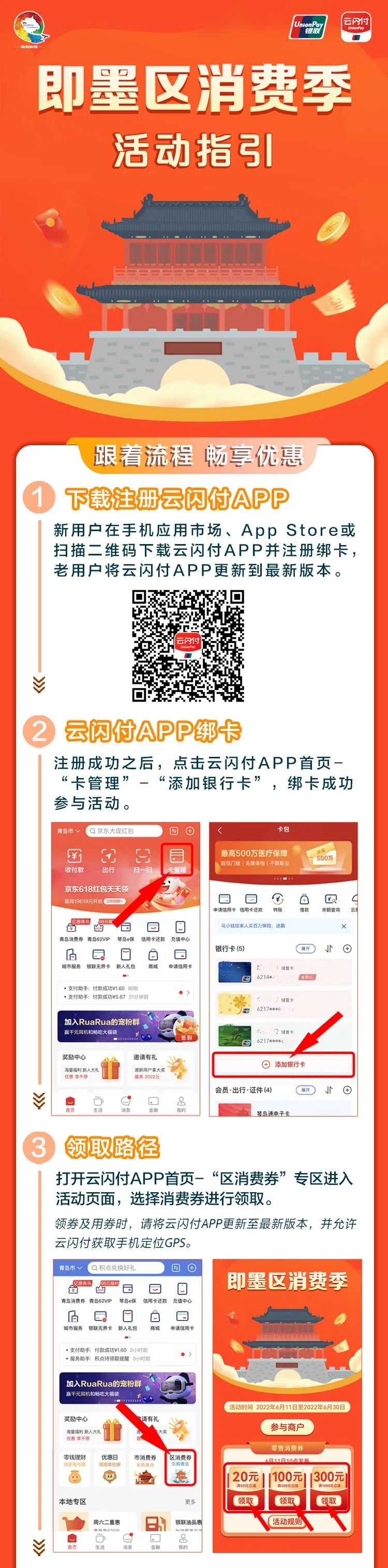 6月11日10:00起,通过云闪付APP首页“区消费券”进入即可领取50减20、300减100、1000减300的优惠券,在指定商户达到消费门槛即可使用。活动期内每自然周(周一至周日为一个自然周)各可领用1张。券到账后即时生效,48小时有效,活动期内每日6:00至24点可核销票券,最晚承兑时间为6月30日24点,逾期未使用视为用户放弃优惠,相应票券将回滚至票券池中可继续领用。6月11日发放20元券10000份、100元券5000份、1000元券1000份,先到先得,领完为止。