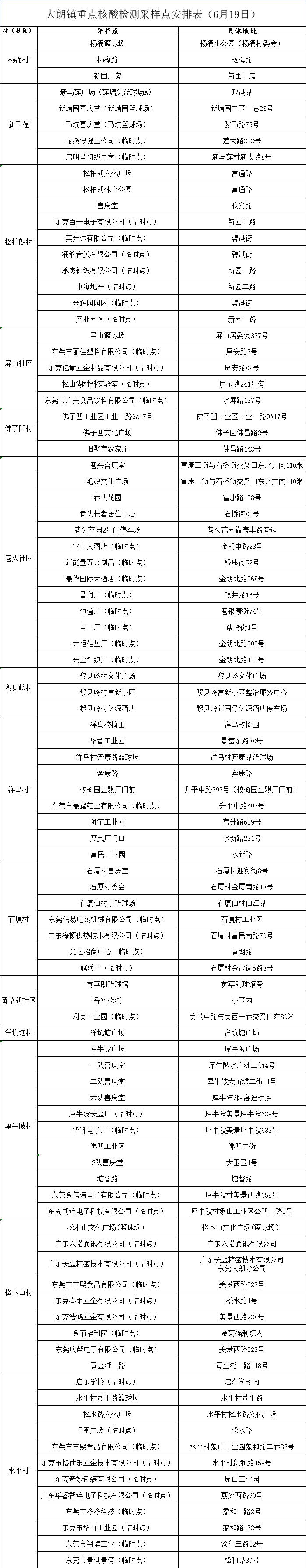 6月19日,大朗开展免费核酸检测抽检的村(社区)有杨涌、新马莲、松柏朗、屏山、佛子凹、巷头、黎贝岭、洋乌、石厦、黄草朗、洋坑塘、犀牛陂、松木山、水平。检测时间为12:00-20:00,采样点设置如下(具体核酸采样点会根据现场实际调整,请以村、社区通知为准):