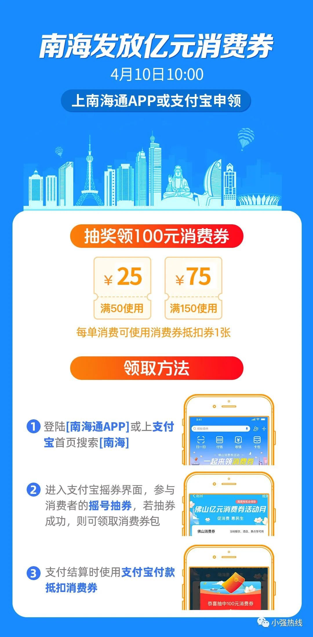 活动内容:将面向南海区所有市民和到南海区的消费者发放消费券,适用于参与活动的开通移动支付功能的南海区内实体经营企业(场所、商家),实行线下到店消费、线上通过“支付宝”支付。