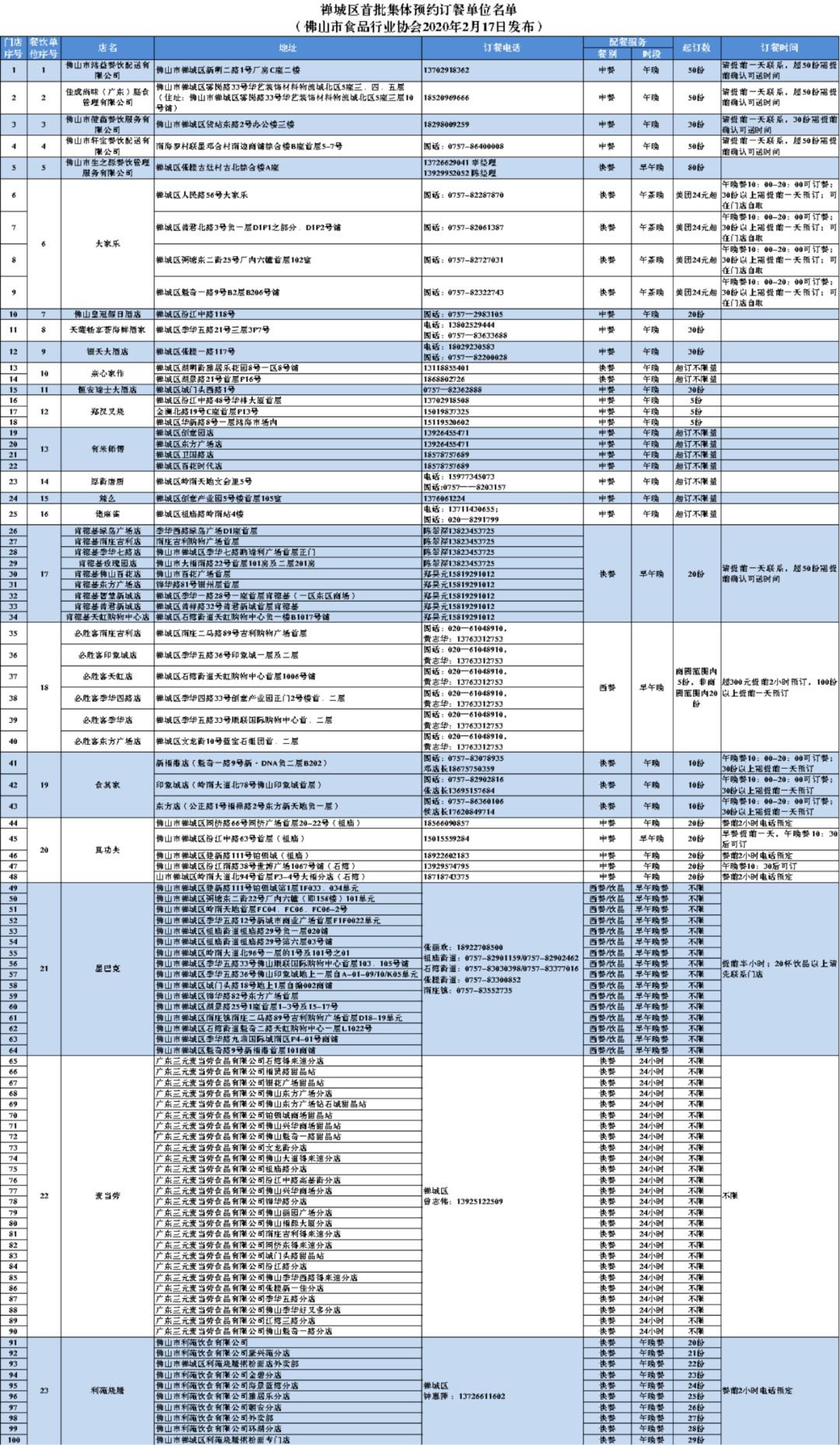 目前,已协调落实禅城区首批23家预约式网络订餐服务单位共100家门店提供预约配餐服务,未来将分批增加发布。