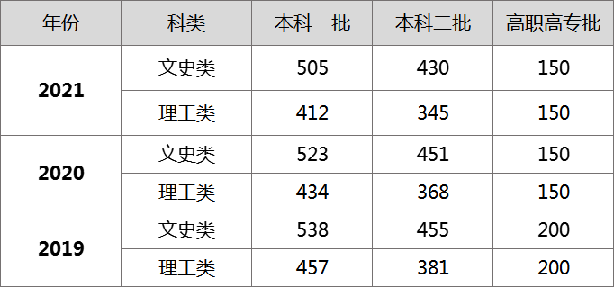 2019-2021年宁夏普通高招最低控制分数线