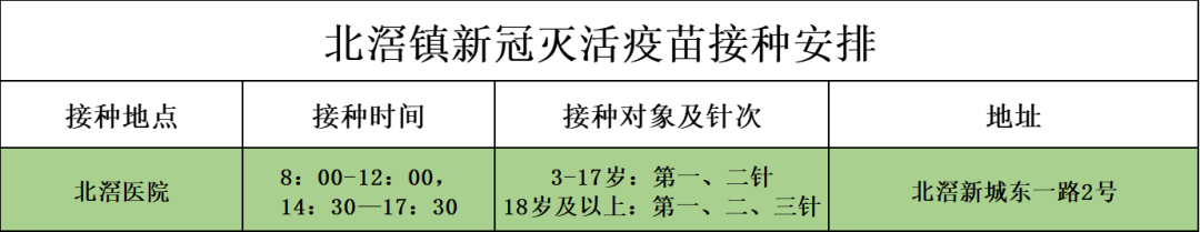| 北滘镇 | 各位街坊请注意,近期仅开放北滘医院新冠疫苗接种点(开放时间:上午8:00-12:00,下午14:30-17:30),其余村居暂停新冠疫苗接种服务。【到苗情况】 接种地点:北滘医院(每天开设)、村居接种点(轮流开设) 接种针次:新冠灭活疫苗第一、二针及加强针。 疫苗情况:(中国生物、科兴中维,免预约) 接种时间:上午8:00-12:00,下午14:00-17:30。 各接种点详细接种安排见下表: ![]() |