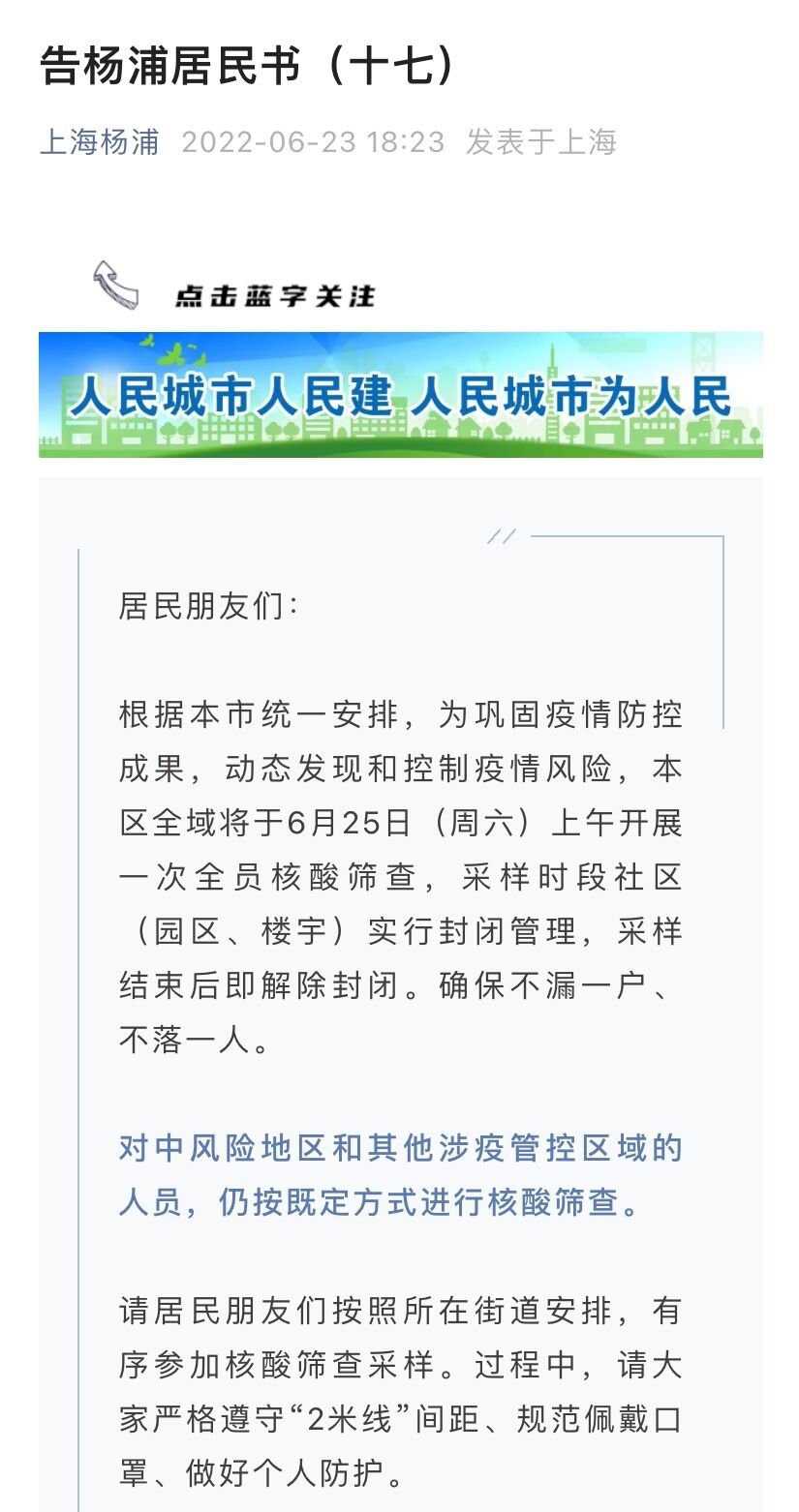 根据本市统一安排,为巩固疫情防控成果,动态发现和控制疫情风险,本区全域将于6月25日(周六)上午开展一次全员核酸筛查,采样时段社区(园区、楼宇)实行封闭管理,采样结束后即解除封闭。确保不漏一户、不落一人。