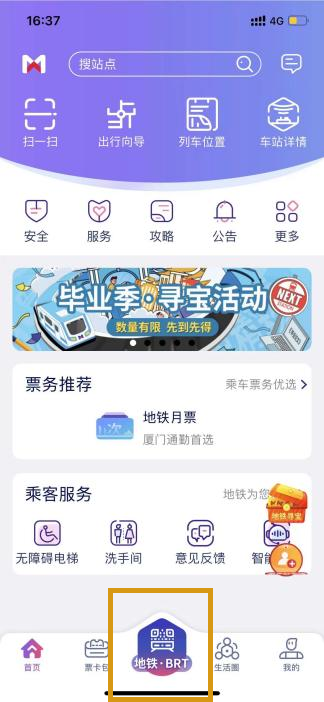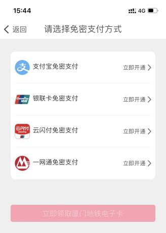 2、领取厦门地铁电子卡:在“厦门地铁AMTR”APP首页点击“地铁•BRT”乘车按钮,绑定一种免密支付方式后,领取“厦门地铁电子卡”。
