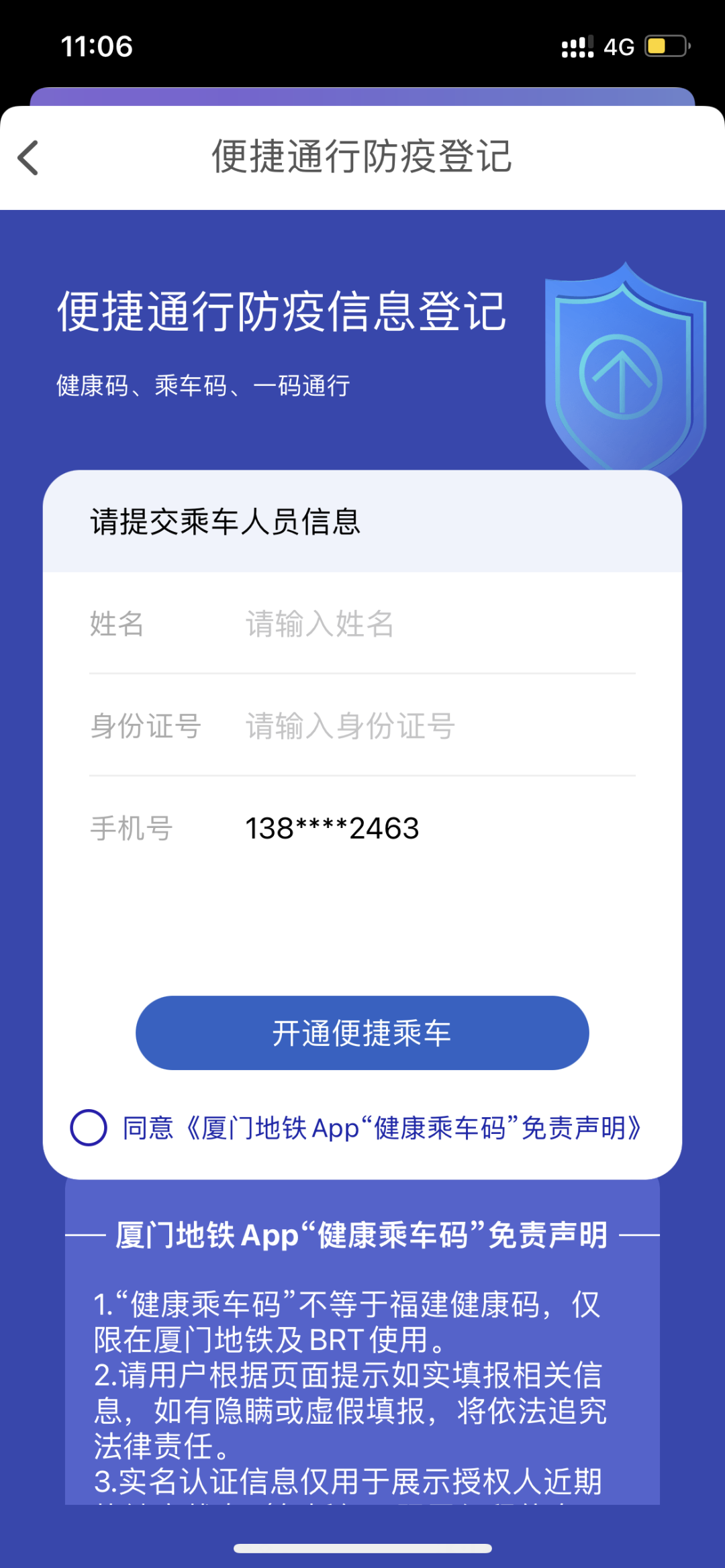 3、实名登记:点击“地铁•BRT”乘车按钮,在乘车二维码下方点击“便捷通行防疫登记”,勾选“同意《便捷乘车防疫登记隐私协议》”,输入姓名、身份证、手机号完成实名认证并授权登记(健康信息仅作前端展示)。