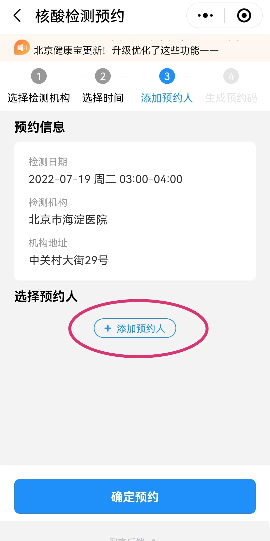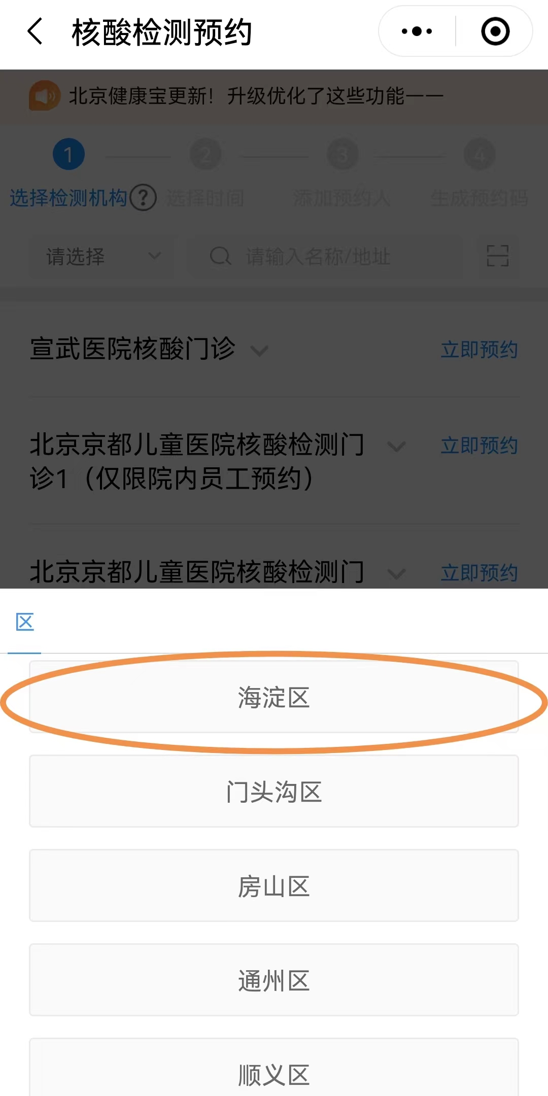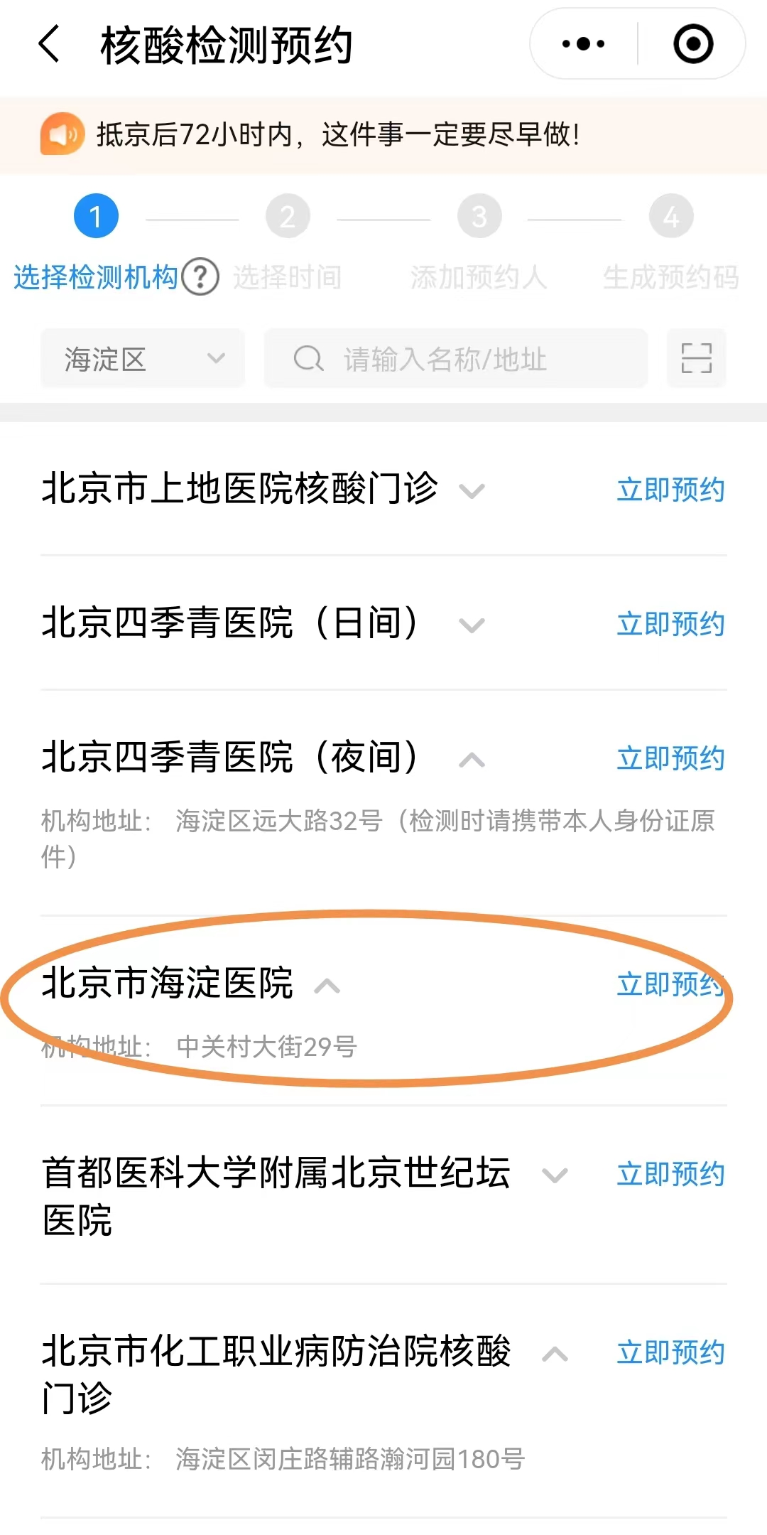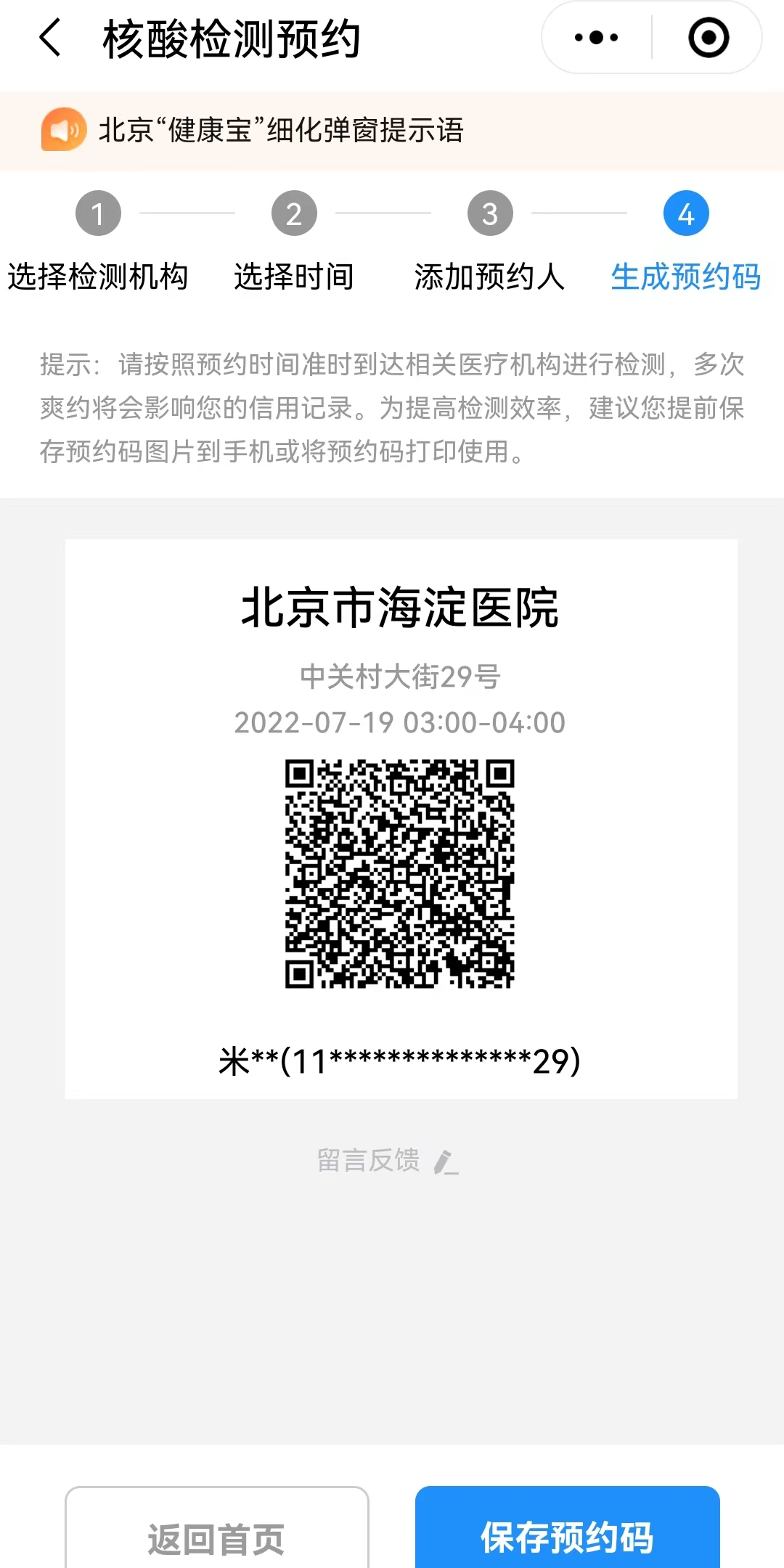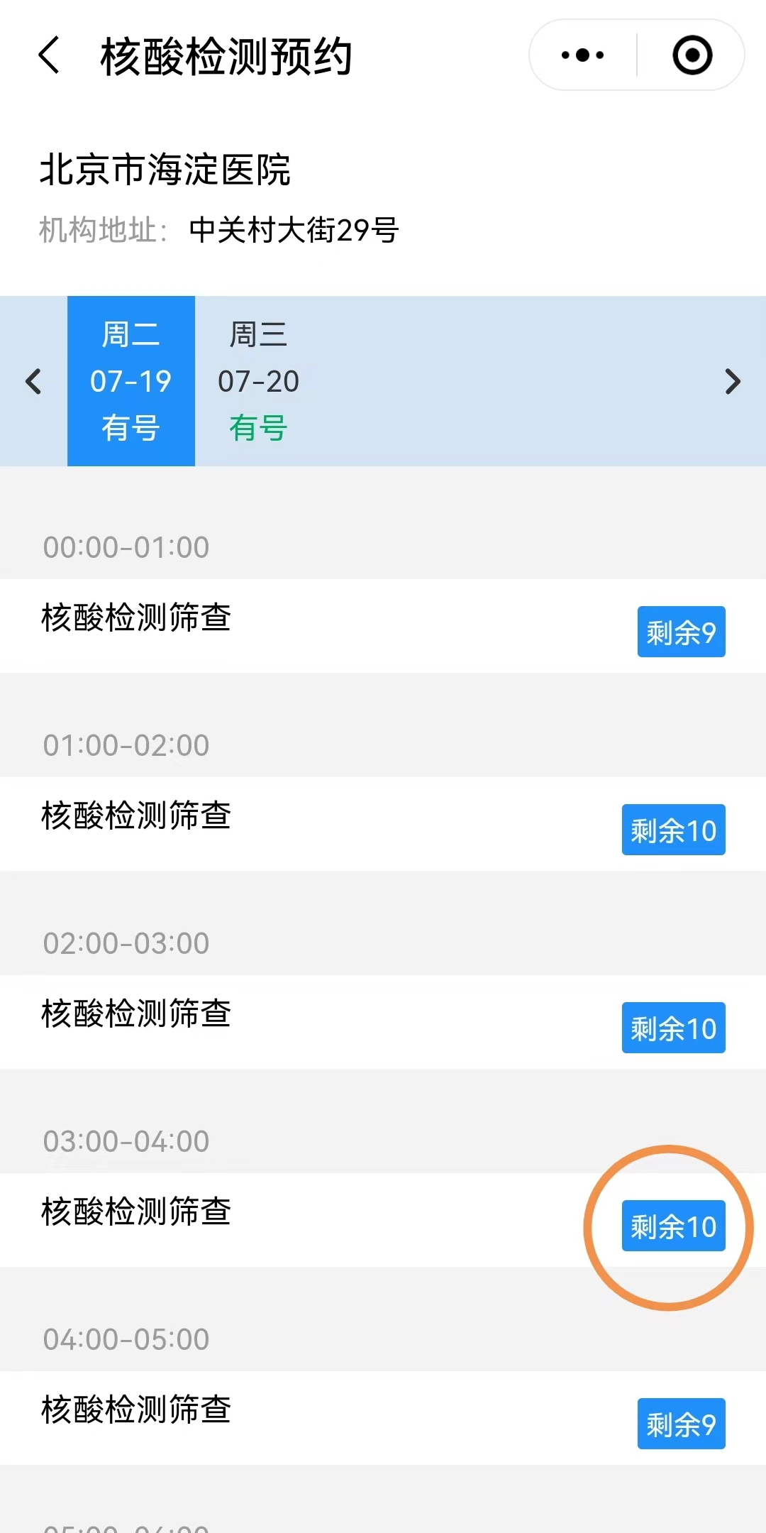 为方便您核酸检测,海淀医院自2022年7月18日起,晚间核酸检测(18:00-次日6:00)实行健康宝预约,放号周期3天,操作方法如下: