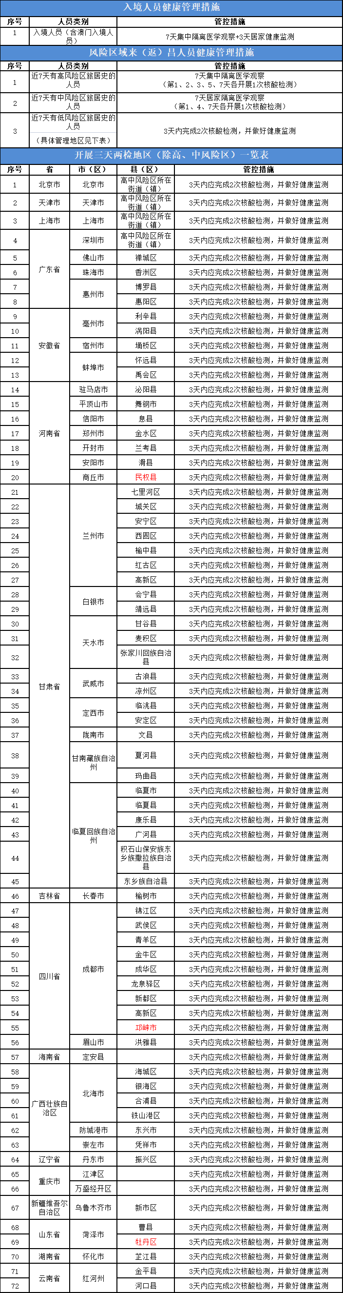 二、来自以下地区的来(返)昌人员严格按照《新型冠状病毒肺炎防控方案(第九版)》要求落实管控措施。